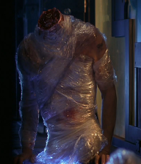 Wujud --; hanya berbentuk tubuhnya, mencoba berjalan dengan tangannya. Sementara kepalanya terletak didekatnya, berteriak dari dalam plastik pembungkusnya.